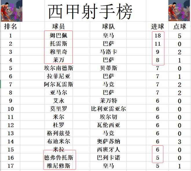 射手榜方面,姆巴佩18球高居榜首,比第2的托雷斯多了7球。穆里奇9球位列第3,莱万8球排在第4。德弗鲁托斯今天打入一球后,还差1球才能追上格列兹曼,米拉,布迪米尔等人挤入前十。